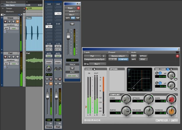 Pro-Tools ma wewnętrzne szyny, zwane busami, którymi możemy kierować sygnały w różne miejsca. Oczywiście, większość DAW tak ma, ale w Pro-Toolsie sygnał z tych szyn może być też przyjmowany przez wtyczki niezależnie od wejść i służy wtedy do kluczowania, czyli właśnie do side-chainu. Robi się to bardzo łatwo, dokładnie tak jak wszystko w Pro-Toolsie czyli tak jak w realu.Wystarczą dwa ślady – stopa i pad. Ze śladu stopy tworzymy send – koniecznie PRE – i wysyłamy sygnał na bus, w tym wypadku Bus 1. W ten sposób niezależnie od głośności stopy na szynę kluczującą wysyłany jest zawsze taki sam sygnał – stopę można w ogóle wyciszyć, jak w przykładzie. Na śladzie pad włączamy kompresor (na przykład pokładowy kompresor z Pro-Toolsa), dokonując w nim pewnych modyfikacji: po lewej stronie wtyczki jest długi klucz – rozwijana lista służy do wyboru wejścia kluczującego, wybieramy tam więc Bus 1. Kompresor musi wiedzieć, że ma pracować w trybie side-chain, służy do tego kluczyk po prawej, obok napisu SIDE-CHAIN, „zaświecamy” go na niebiesko. Wygląda to tak: