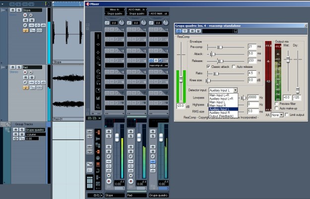 Kompresor jak kompresor, pełno funkcji, zgoda, ale co w nim takiego ciekawego? Dla naszych potrzeb dwie rzeczy. Po pierwsze – jest to kompresor wielokanałowy i pozwala na wybór źródła sygnału sterującego. W insercie na śladzie np. kwadrofonicznym możemy wybrać, żeby kluczowany był tylnym kanałem a nie przednim. Tylny kanał w Cubase nie przechodzi na wyjście stereo czyli mamy to co trzeba! Wyboru źródła sygnału sterującego (kluczującego) dokonujemy niepozorną opcją „Detector input” ((jak widać, mam starą wersję reacompa, działa równie dobrze):