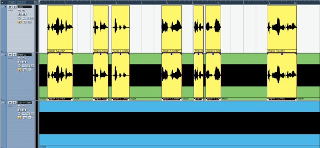 Wygląda to może na długą i skomplikowaną procedurę, ale w rzeczywistości jest bardzo szybkie i logiczne. Umożliwia uzyskanie regionów z dźwiękiem o stałej głośności, które możemy wykorzystać do sterowania kompresorem nie przejmując się już tak bardzo parametrami Ratio i Threshold, gdyż ich ustawienie jest dużo łatwiejsze, a stopień kompresji stały. Dodatkową zaletą tej metody jest możliwość wzrokowej kontroli sygnału sterującego i łatwej ingerencji – na przykład połączenie niektórych regionów ze sobą, aby krótkie przerwy na oddechy nie „wyciągały” muzyki z tła.
