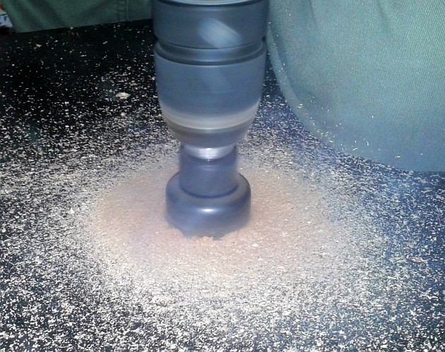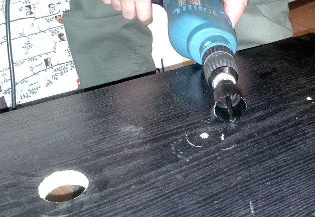 Pierwsze otwory były wykonane tą niezbyt dobrą otwornicą, co chyba niestety widać. Oczywiście płytę nawiercamy otwornicą z dwóch stron, a nacisk stopniujemy z wyczuciem, żeby otwór nie wyglądał tak, jak na moim zdjęciu – to co, że to będzie od środka 😉