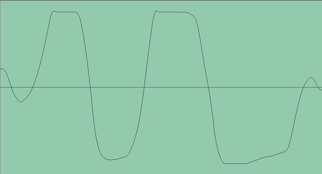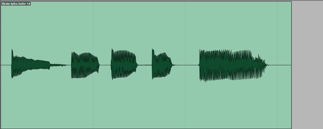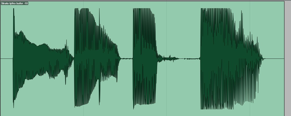 Jak widać i słychać, poziom jest w porządku, maksymalny poziom to jakieś -10dBFS – dużo. Ten stratocaster ma duży poziom wyjściowy i trzeba mieć sprzęt, który to „przyjmie” i „odda”. Posiadając interfejs z wejściami i wyjściami o poziomie +4dBu bez problemu nagramy i odtworzymy każdą gitarę, i jeżeli uporamy się problemami związanymi z pętlą mas, to w zasadzie nic nam nie jest potrzebne, może poza buforem o wzmocnieniu jednostkowym. W praktyce – potrzebna będzie jeszcze separacja galwaniczna, również o wzmocnieniu jednostkowym, a więc raczej nie pasywny dibox, który sygnał zwykle osłabia, poza tym zauważmy, że poziom sygnału jest bardzo wysoki, mały transformatorek z diboxa może sobie z takim poziomem nie poradzić. Interfejs z poziomem -10dBV i wiele interfejsów z wejściami instrumentalnymi, które nie mogą osłabić sygnału, w ogóle nie poradzi sobie z takim poziomem. Koniec, kropka, nie da się nagrać i odtworzyć gitary bez obniżenia poziomu. Przy okazji – tak, ta gitara po nagraniu tak dziwnie „wygląda”, wbudowana elektronika swoje robi.