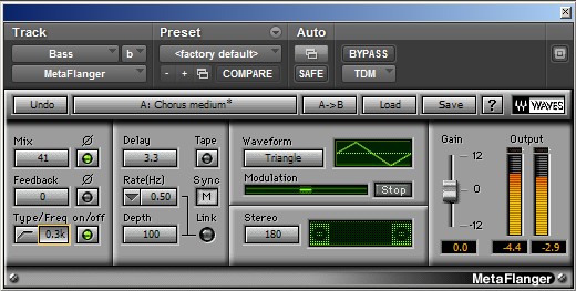 Na przykład wtyczka MetaFlanger firmy Waves ma filtr (HPF albo LPF) działający w torze efektu, tak więc można bez problemu używać jej jako chorusa stereo na insercie śladu basowego, nie ryzykując problemów z dołem:
