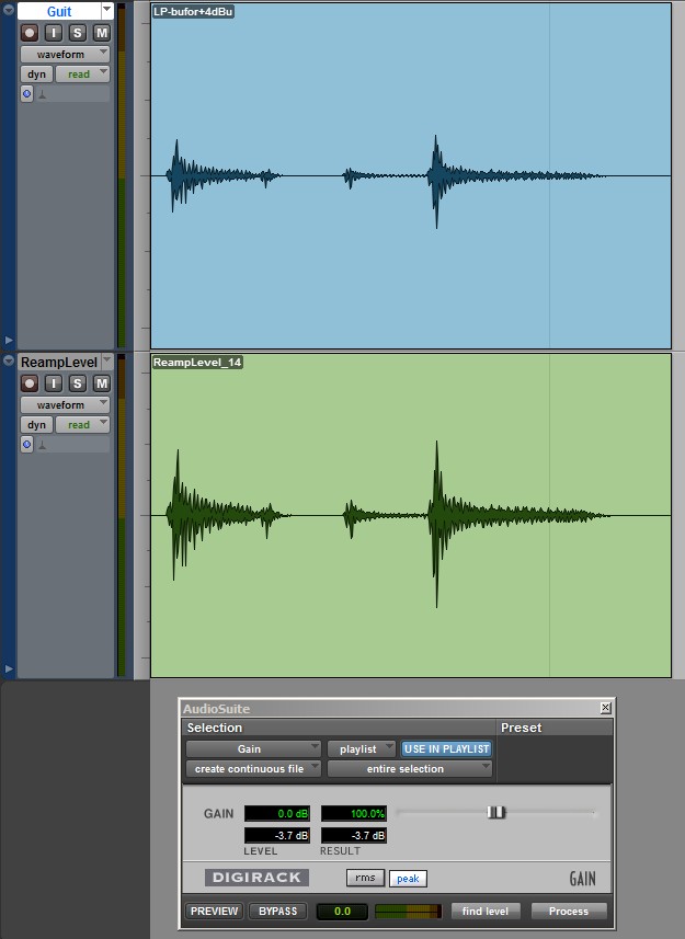 Jak widzimy, Palmer DACCAPO pozwala na niewielkie (niecałe 2dB) wzmocnienie sygnału wyjściowego, ale użycie potencjometru regulującego lub tłumika oznacza tylko zmniejszenie tego poziomu. DAW-AMP natomiast pozwala nagrać i odtworzyć bez zniekształceń sygnał około 4-6dB wyższy – niby niewiele, ale akurat o te parę decybeli chodzi. W powyższym przykładzie sygnał z gitary o 3dB przekracza maksymalny poziom wejściowy (i wyjściowy) interfejsu pracującego z poziomem -10 – w celu nagrania musielibyśmy sciszyć gitarę co najmniej o 3dB, a więc podczas odtwarzania (reampingu) albo musielibyśmy pogodzić się z innym brzmieniem czy charakterem przesteru albo zwiększyć „czymś” poziom o te 3dB. Palmer DACCAPO tego nie zapewni, natomiast DAW-AMP – tak. DAW-AMP może zmniejszyć poziom podczas nagrania i zwiększyć podczas odtwarzania – tym samym transformatorem, a więc tyle samo 😉