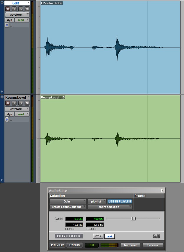 Wracając do pomiarów – podłączmy sygnał z wyjścia komputera, sygnał o poziomie dokładnie odpowiadającym poziomowi z gitary, do naszych urządzeń testowych. Konfiguracja wygląda następująco: wyjście z interfejsu symetrycznie do DACCAPO albo DAW-AMPa, z urządzenia wyjściem na wzmacniacz przez bufor z powrotem do komputera w celu dokonania pomiaru. Przez bufor, to ważne, ponieważ Palmer ma zwiększoną impedancję wyjściową, a i DAW-AMP niekoniecznie musi być aż tak mocno obciążany. Najpierw Palmer Daccapo – na górze sygnał wyjściowy (o poziomie szczytowym -9,2dBFS), na drugim śladzie powrót po rampboxie, na dole poziom szczytowy sygnału wyjściowego z reampboxa. Poziom wyjściowy ustawiony na maksimum, to znaczy potencjometr wyjściowy na maksimum, a przełącznik poziomu (czyli tłumik) na -10: