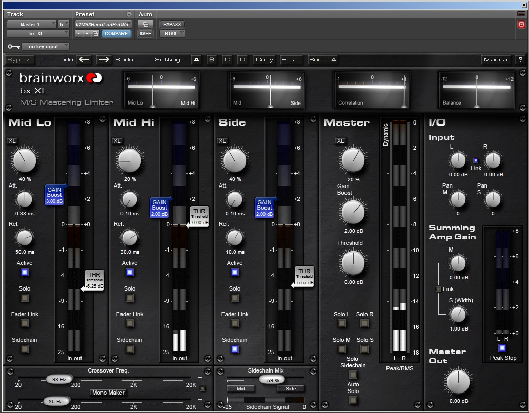 No dobrze – ale jak to zrobić? Na szczęście producenci wtyczek wiedzą o problemie, i produkują narzędzia, którymi można ten problem rozwiązać. Przoduje w tym firma Brainworx, która w swoich procesorach przeznaczonych do pracy na sumie miksu dodaje moduł „Mono-maker” – jedną gałkę, pozwalającą na monofonizację pasma poniżej wybranej częstotliwości. Działa to bardzo dobrze i „inteligentnie” – to znaczy, poziom sygnału nie zmienia się. Taki moduł znajduje się tak w limiterze bx_xl: