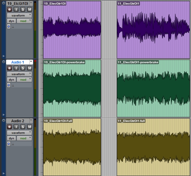 W tej części dwa trochę dłuższe ślady gitarowe, wzięte z sesji Cnoc An Tursa: ‚Bannockburn’ oraz Hollow Ground: ‚Left Blind’. Są to ślady o nazwach odpowiednio 19_ElecGtr1DI z pierwszej sesji oraz 11_ElecGtrDI1 z drugiej. W sesji Pro-Tools wygląda to jak poniżej – starałem się zrównać poziomy jak tylko się dało: