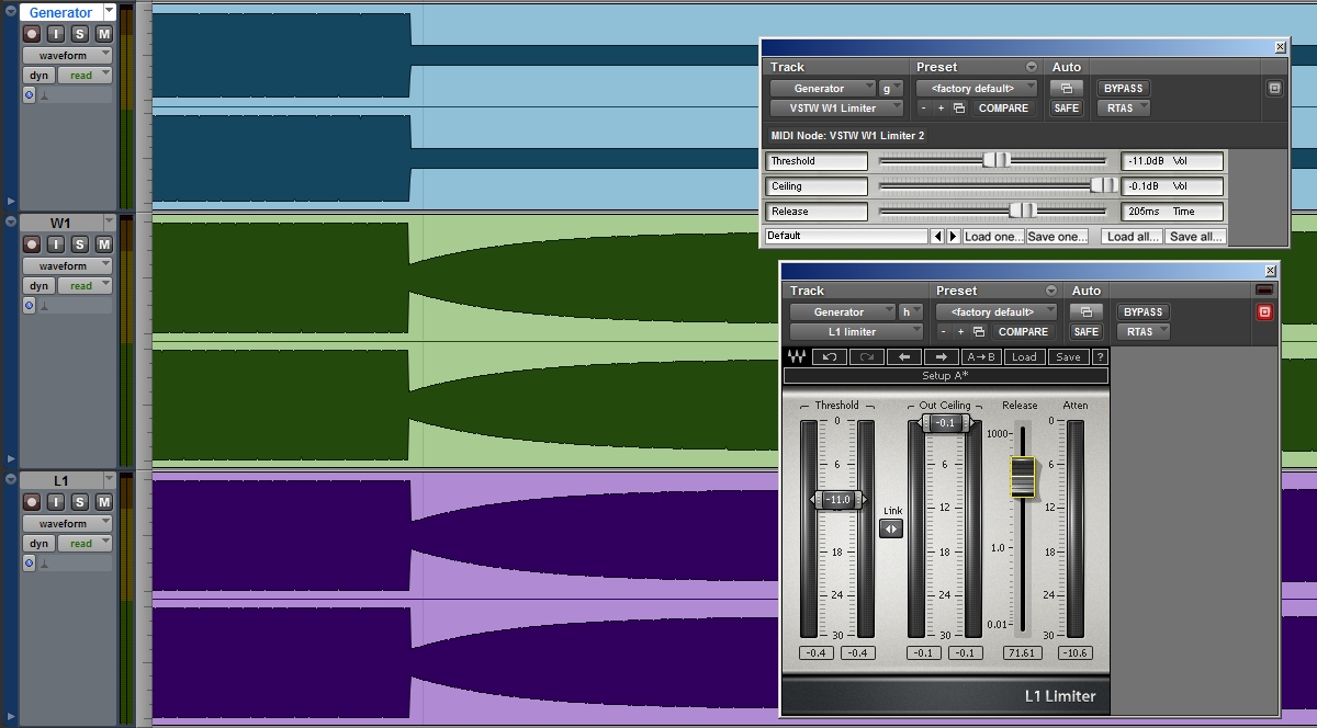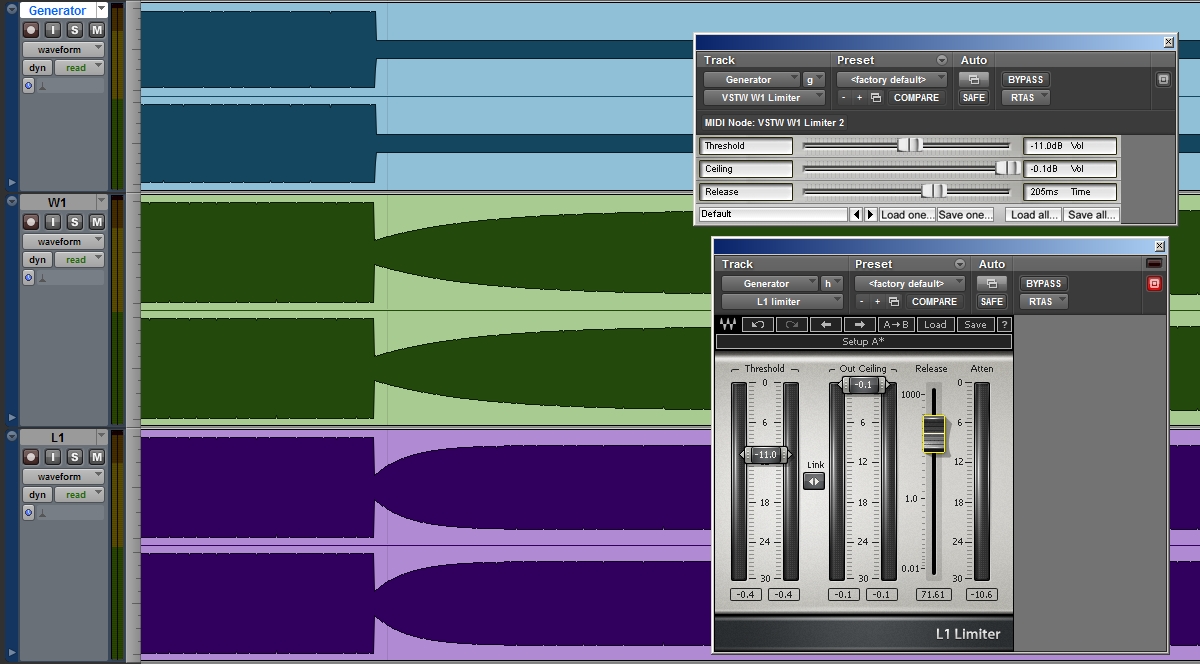 Wadą W1 jest brak wskaźnika tłumienia – i dobrze jest przeczytać na stronie producenta, że: „final version will introduce limiting meters” – to znacznie ułatwi korzystanie. Szybki test odsłuchowy pokazuje, że wtyczka rzeczywiście brzmi bardzo podobnie do L2, choć autor zastrzega, że identycznej charakterystyki powrotu nie udało się zrobić. W oczekiwaniu na wersję z miernikiem postanowiłem sprawdzić, czy rzeczywiście L1 ma „oszukane” czasy powrotu – George Yohng pisze, że „Waves L1 famous limiter (…) uses three times longer actual release time than standard RT60 metric. This means that if you set 50ms release in the limiter, it will actually yield with 150ms standard RT60 release time.” Poniższe dwa zrzuty pokazują, że albo w nowej wersji Waves zostało to zmienione, albo ja czegoś nie rozumiem – w każdym razie zachowanie obu wtyczek jest przy takich samych czasach identyczne:
