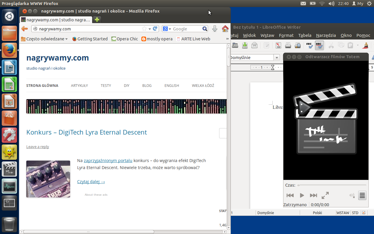 Zainstalowałem linuxa, konkretnie trochę mi znanego Ubuntu, w polskiej wersji pod nazwą Przyjazny Puchacz, niezbyt nową, bo 12.04 w terminologii linuxowej oznacza kwiecień 2012. Instalacja jest banalna, dokładnie opisana w sieci, włącznie z procedurą sporządzenia startowego instalacyjnego pendrive. W tej dystrybucji jest wszystko, czego do codziennego użytku potrzebujemy – i to naprawdę działa. Stary i ledwo dychający komputer dostał skrzydeł, działa szybciej i nieporównanie stabilniej, a głośniczek nagle zaczął być słyszalny, często nawet za głośny! Nie trzeba mieć wykształcenia komputerowego do jego obsługi, rodzinie się spodobał, a ja jednocześnie polecam go wszystkim Fakt, kubusia ani protoolsa na nim nie uruchomimy, ale wszystko inne – tak. I antywirusa nie potrzeba 😉