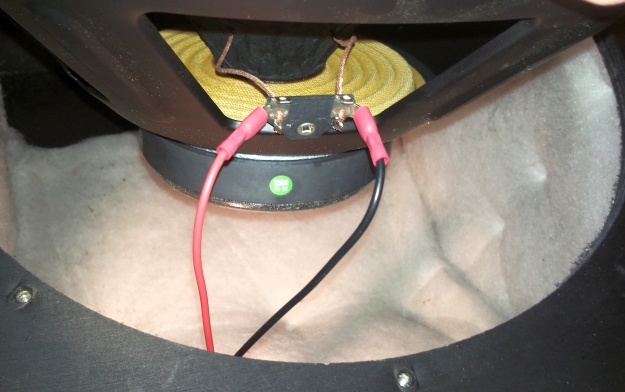 Wewnątrz obudowa jest lekko wytłumiona czymś, co przypomina watolinę – bez przesady, jak na bass-reflex przystało. Wszystko solidne, z użyciem złączek, no, może poza piezakiem, który zaufania wagą nie budzi, podłączony przez kondensator 1μF za wiele też nie gra – zresztą głównym powodem demontażu pieca było pozbycie się tego piezaka, bo nic nie daje tylko szumi 😉