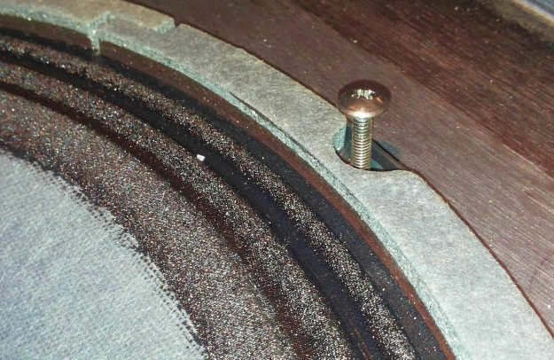 Odkręcenie śrub to pikuś – ale siatka jest oprócz tego solidnie przyklejona (czarną dwustronną taśmą, czy też raczej substancją), żeby nie brzęczała – a podważyć nie bardzo jest jak. Ale się udało – straty w wyglądzie niewielkie, małe wybrzuszenie, drobiazg. Po zdjęciu siatki uzyskujemy dostęp do głośników. Głośnik wysokotonowy przykręcony jest normalnie, wkrętami do sklejki, ale niskotonowy porządnie, od tyłu są gwintowane „zaczepki”. Resor głośnika jest płócienny.