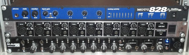 Jako pierwszy na stół idzie stary interfejs MOTU 828 w pierwszej wersji. Jest to jeden z pierwszych interfejsów firewire, pamiętam, że na targach Music Messe wzbudzał ogromne zainteresowanie – trzynaście lat temu! Firma MOTU dba o swoich klientów, wciąż dostępne są działające sterowniki i MOTU 828 działa z najnowszymi komputerami i systemami operacyjnymi – szacun 😉