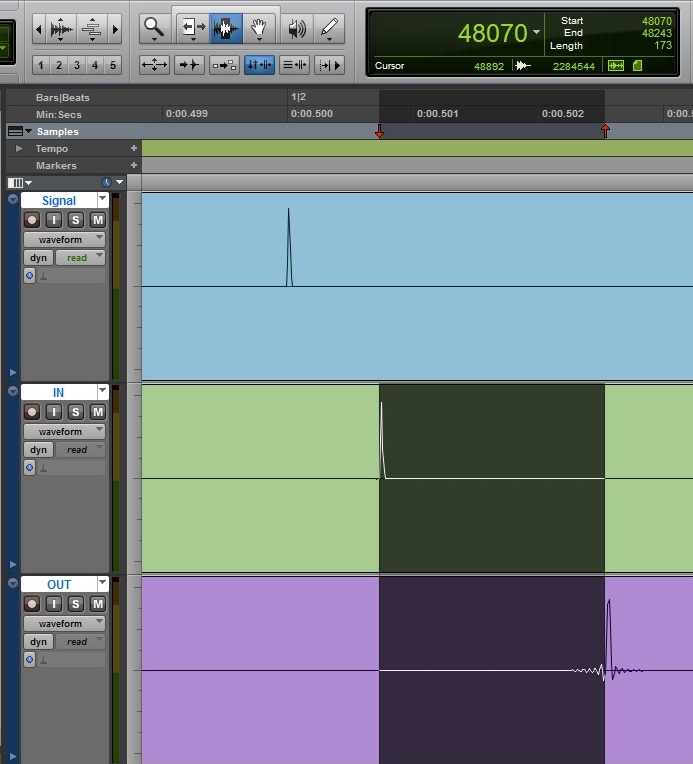 Przy częstotliwości próbkowania 44,1kHz mamy opóźnienia w odsłuchu około 1,8ms, przy częstotliwości 96kHz już tylko około 0,83ms. Nie jest źle, zwłaszcza ten drugi wynik, ale tak super to też nie jest. Większość interfejsów w teście, również wiekowy MOTU 828, wykazywało się lepszymi parametrami…