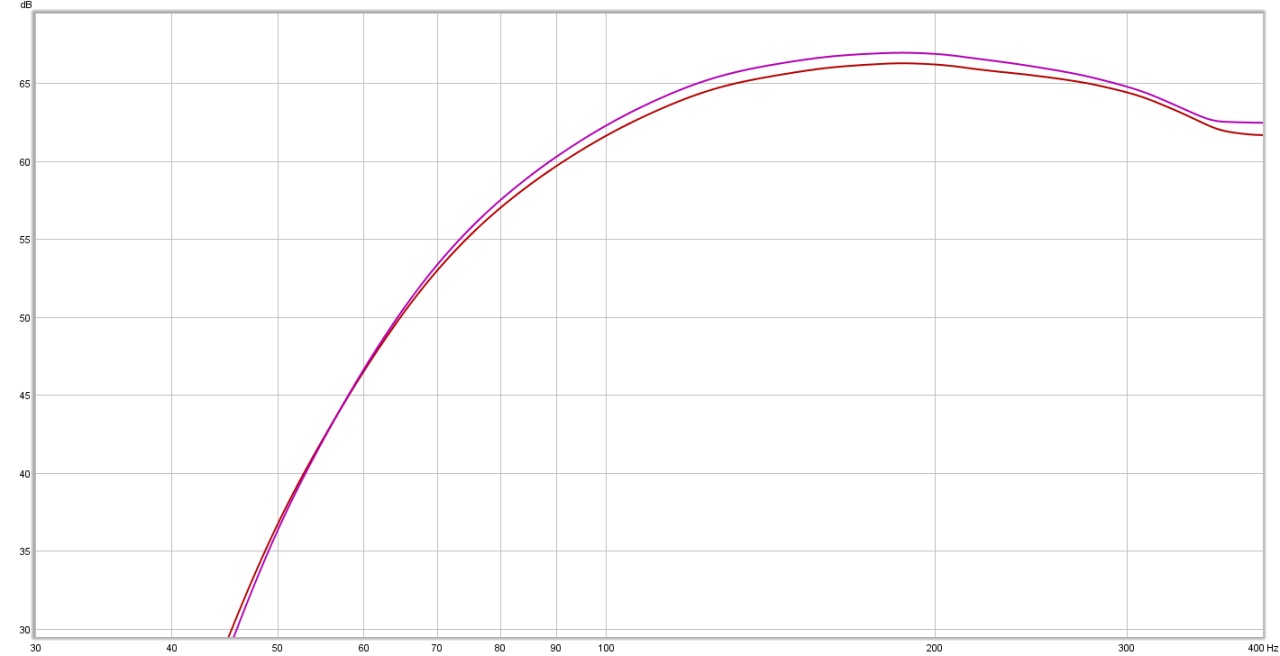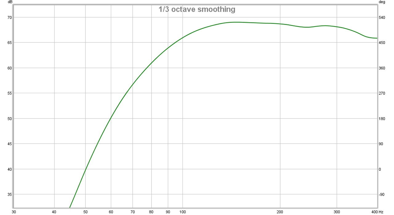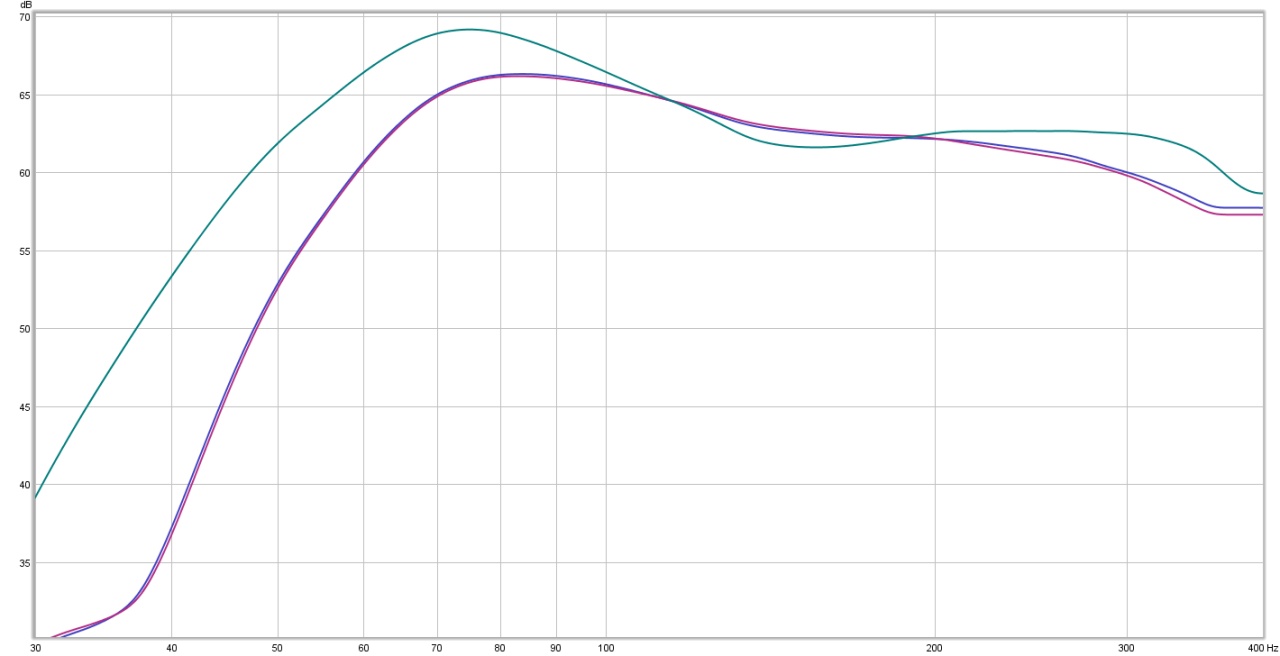 Jak widzimy, różnice w ustawieniach są w tym aspekcie nieistotne, a charakterystyka opada bardzo szybko, spadek zaczyna się powyżej 100Hz, a nachylenie wynosi około 24dB/okt. No, nie da się ukryć, dołu nie ma…