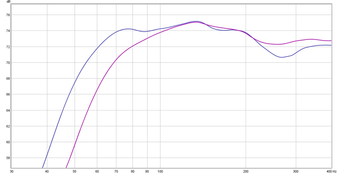 Według danych producenta kolumna ProLine 410 ma pasmo do 70Hz, a kolumna NeoLine 112 do 50Hz – nie wiemy, przy jakim spadku, możemy domniemywać, że takim samym. W każdym razie 112 „schodzi niżej”. Co pokazały pomiary? Proszę bardzo, poniżej oba na jednym wykresie – fioletowy 410, niebieski 112:
