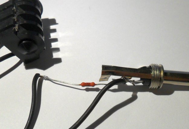 Tak, to jest kreska, spadek ułamków decybela na krańcach pasma, co to zresztą za problem – w każdym razie na pewno pasmo przenoszenia nie jest przeszkodą w uzyskaniu „tego czegoś”. No to może producent przesadza z tą impedancją wejściową i w rzeczywistości jest niższa? No to… trzeba zmierzyć. Wykonałem w tym celu niezwykle skomplikowany przyrząd, który od teraz będzie mi służył do pomiaru impedancji wejściowej wszystkiego, co mi wpadnie w ręce – bo, uprzedzając fakty, warto to mierzyć. Przyrząd taki każdy może wykonać sobie sam: