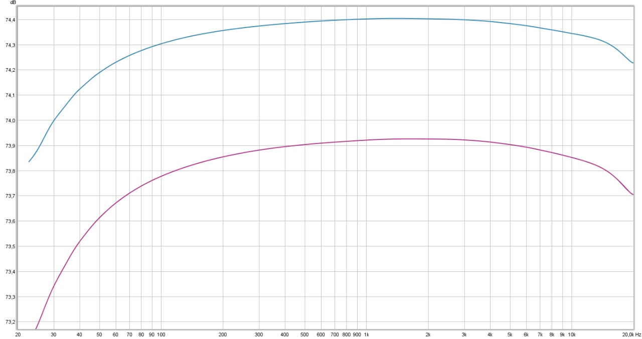Różnica w poziomie w zakresie średnich częstotliwości wynosi prawie dokładnie 6dB, sygnał spada o połowę, więc rezystancja wejściowa rzeczywiście wynosi 1 MΩ. Nie, żeby to był jakiś wyczyn, ale miło, że producent nie ściemnia. W górze oczywiście spadek, spowodowany pojemnością wejścia. Ile ta pojemność wynosi, mniej więcej chociaż? Pomijając cos φ i inne czynniki można powiedzieć, że jest to jakieś 10pF, coś tego rzędu. A więc w zasadzie nic, biorąc pod uwagę prawie stukrotnie większe pojemności kabla, z jakim takie wejście zwykle współpracuje. I nic dziwnego, układ wejścia instrumentalnego wykonany jest na układzie TL074, trudno tu coś zepsuć.