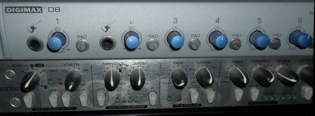 Do zbadania tego wątku sprowokował mnie kontakt z przedwzmacniaczem Presonus Digimax D8. Fajne urządzenie, oprócz wzmacniaczy mikrofonowych z tłumikami wyposażone w dwa wejścia instrumentalne. No to podłączyłem tam bas…