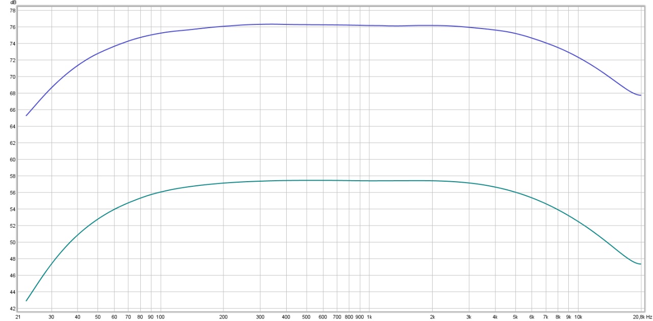 Ze spadku poziomu 18-19dB widzimy, że oporność wejściowa wynosi faktycznie około 130kΩ, natomiast wpływ pojemności wejściowej jest malutki, praktycznie żaden, a zatem i pojemność wejściowa jest mała – zdecydowanie mniejsza niż 10pF Presonusa.
