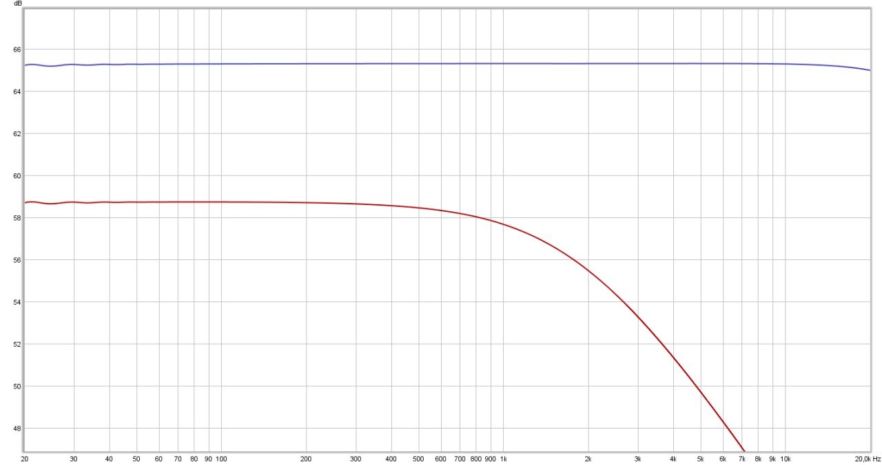 Ciekawe! Jak łatwo zauważyć, impedancja wejściowa w średnicy też wynosi 1MΩ (spadek sygnału o 6dB), ale pojemność wejściowa i związany z tym spadek dla wyższych częstotliwości to zupełnie inna bajka. Ile, mniej więcej? Podobnie jak Fender – wychodzi na oko około 100pF – dziesięć razy więcej, niż w przypadku interfejsu Presonus DB8! Rząd wielkości! To jest bardzo dużo. Wydaje się, że to nie powinno grać, a gra. I to na ucho (i na palce) lepiej, niż teoretycznie lepsze, o mniejszej pojemności wejściowej wejście Presonusa. Teraz wiem, dlaczego – pojemność wejściowa jest podobna do pojemności wejściowej rzeczywistego wzmacniacza lampowego.