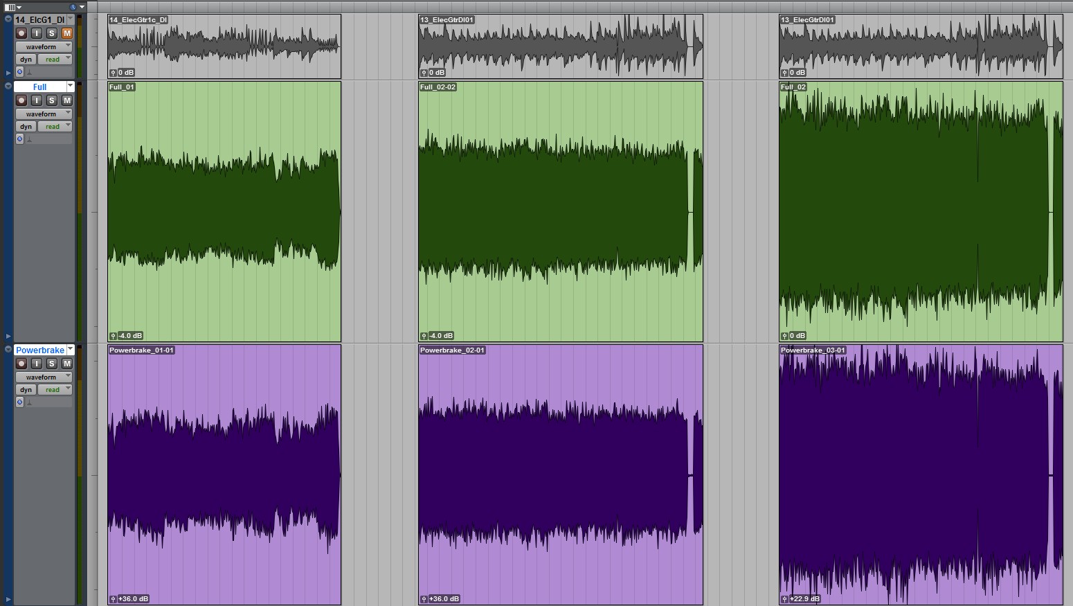 Na pierwszym śladzie jest źródłowy sygnał gitary DI, na drugim nagranie mikrofonowe bez tłumika, z maksymalną głośnością, a na trzecim nagranie mikrofonowe z głośnikiem podłączonym przez powerbrake. Ustawienia wzmacniacza, mikrofonu i przedwzmacniacza są takie same przez cały czas. W sesji mamy po nagraniach takie coś: