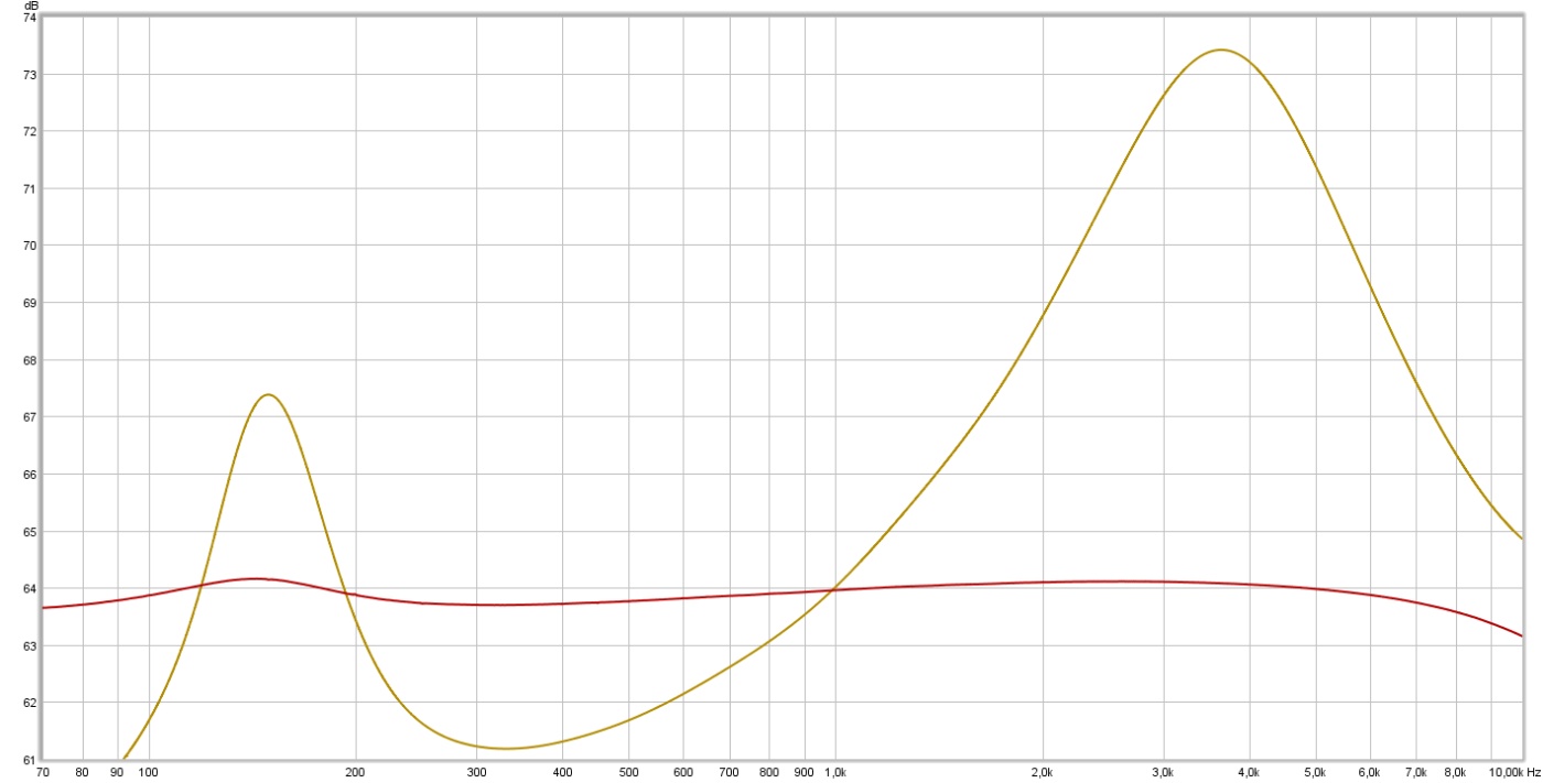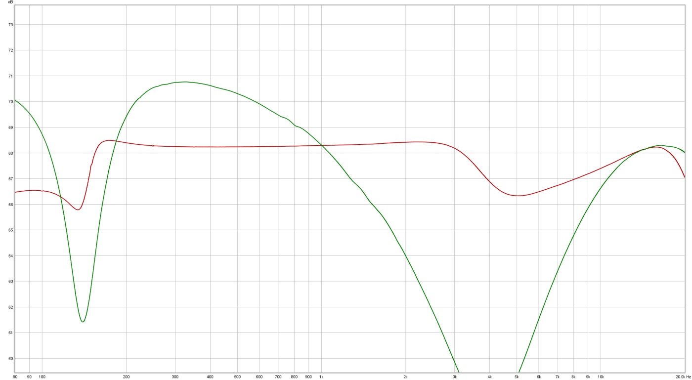 Widzimy dwie spore górki – jedna w rezonansie ok 150Hz, a druga na 3,5kHz, trochę poniżej częstotliwości podziału. Wzmacniacz tranzystorowy też „zauważa” zmiany impedancji obciążenia, ale niewiele sobie z nich robi. A wzmacniacz lampowy? Na 3,5kHz mamy o 10dB wyższe napięcie na wyjściu!