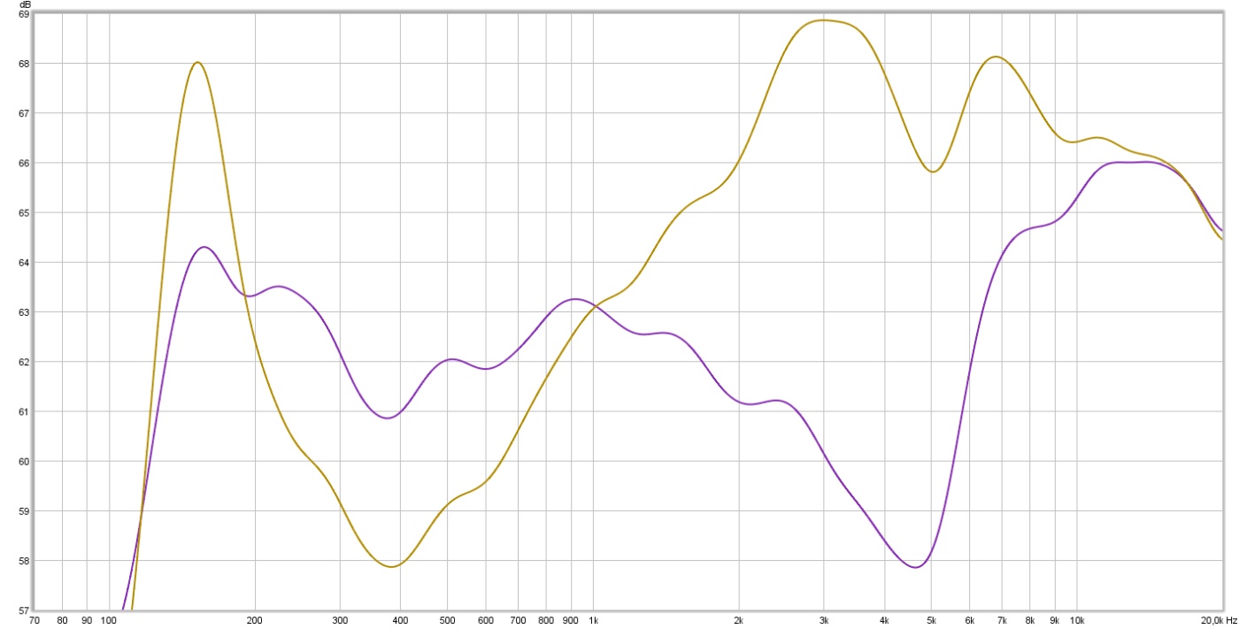 Zmierzmy, co słychać. Wiadomo, pomiar orientacyjny i oczywiście wpływ pomieszczenia, ale jest to pomiar porównawczy, ustawienia mikrofonu i głośnika są niezmienione, zmienia się tylko końcówka mocy (fioletowy – tranzystor, żółty – lampa):