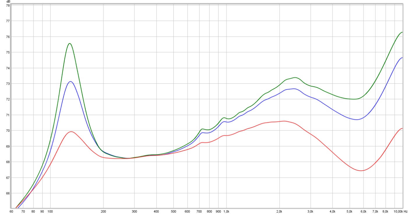 Pomiar impedancji wyjściowej wzmacniacza oczywiście jest możliwy, ale przecież łatwiej, szybciej i od razu z potwierdzeniem koncepcji wynik można uzyskać mierząc napięcie wyjściowe na głośniku – z tłumikiem i bez, przy czym tłumik w wersji eksperymentalnej rozłożony na deseczce ma możliwość zmiany impedancji wyjściowej. Rzecz jasna poziom też się zmienia, dlatego wszystkie wykresy poniżej są w celu łatwiejszego porównania przesunięte. No to bierzemy „osiemsetę” z korektorem ustawionym mniej więcej „na zero” – to się nigdy nie udaje, ale na szczęście chodzi tylko o porównanie, podłączamy głośnik Celestion G12T-75 w obudowie zamkniętej i przy pomocy doskonałego programu REW mierzymy napięcie na wyjściu. Niebieski, „środkowy przebieg to napięcie na wyjściu wzmacniacza obciążonego głośnikiem, czyli to, do czego dążymy: