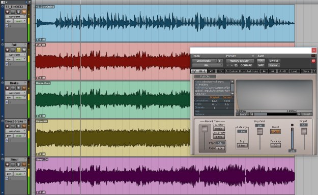 W poniższej sesji Pro-Tools mamy: plik czystej gitary ze znanej strony, nagranie mikrofonowe z pełną mocą, nagranie mikrofonowe przez powerbrake (od razu zgłośnione), liniowy sygnał z wyjścia wzmacniacza obciążonego tłumikiem bez podłączonego głośnika nagrany przez dibox, ostatni ślad to sygnał direct przegrany przez pogłos splotowy Waves IR-L z wgraną odpowiedzią impulsową głośnika Celestion Seventy 80 nagrywanego mikrofonem Heil PR20, dokładnie w takich ustawieniach, jak ślady nagrywane przez wzmacniacz.