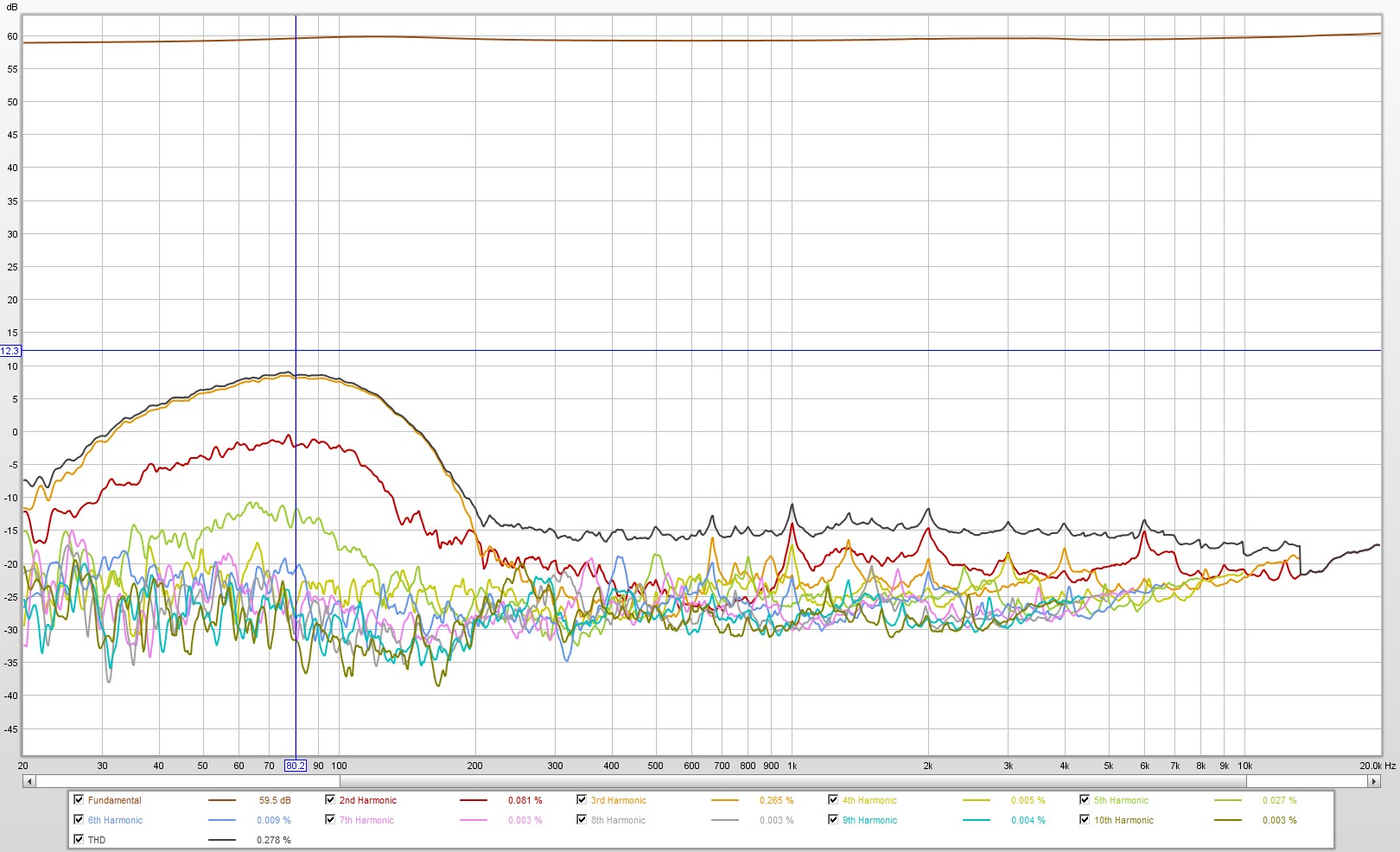 Jak widać, w dole zniekształcenia z pomijalnych 0,02% rosną do wartości już znaczącej, bo prawie 0,3%. Jasne, nadal nie jest to wielki problem, ale tu już można dyskutować, bo różnice są spore. Oczywiście – nie są to zniekształcenia wzmacniacza, tylko zniekształcenia zmierzone na zaciskach słuchawek, za opornikiem.