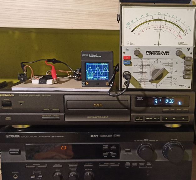 No to w nowy rok zmarnowałem płytę CD 😉 i nagrałem na niej sygnały testowe. W szczególności nagrałem sinus z poziomem 0dBFS, czyli maksymalny poziom sygnału szczytowego, jaki można zmieścić na płycie. Zobaczmy jak normalnie nagrana płyta spisuje się w standardowym zestawie hifi. Sprzęt użyty do pomiarów to system „sypialniany” służący do niezobowiązującego cichego plumkania. Nie jest to może przykład bardzo reprezentatywny jeżeli chodzi o brzmienie, ale zestawiony jest z dość standardowych elementów.
