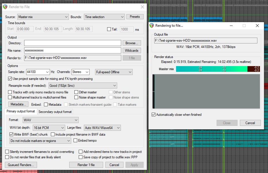 Procesor i7-4790, System Windows 10 Pro, jak widać 16GB RAM, system na zwykłym dysku HDD jak w poprzednim przypadku. Komputer pracujący, z mnóstwem programów. Tutaj niestety też różnice są bardzo małe – aż tak małe, że się wkurzyłem i nie zrobiłem screenów z dwóch pomiarów zanim wyjąłem dyski… Krótko mówiąc – jeszcze mniejsze niż w starym komputerze, rzędu 10%. A to, na czym mi najbardziej zależy, czyli zgranie – sesja 60 śladów, pełno wtyczek i automatyki – wygląda tak: